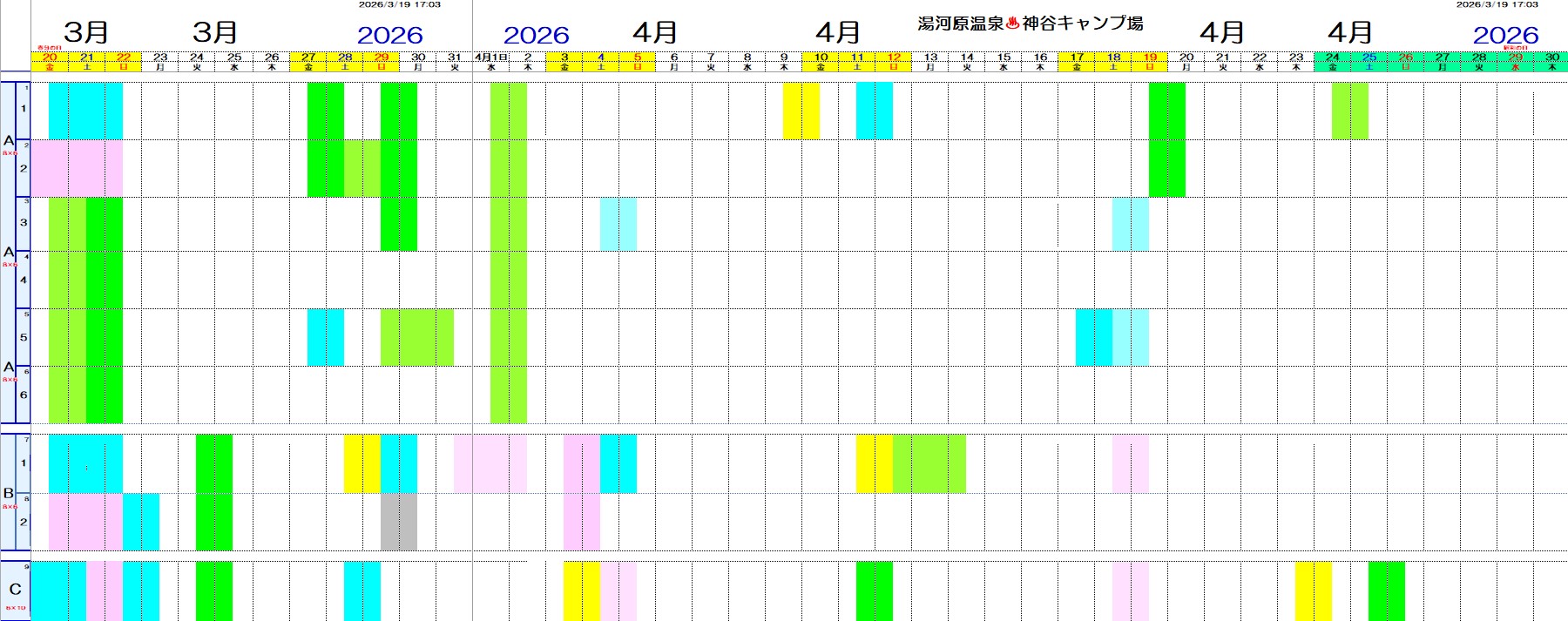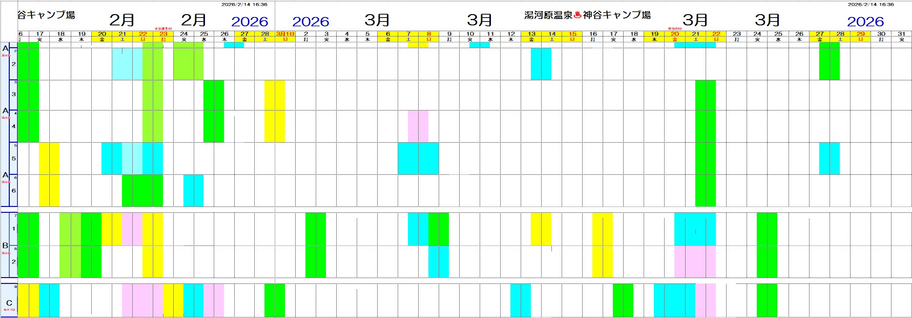 ※黄色(ソロ)、青(大人2名)、緑(グループ)、ピンク(ファミリー)部分はご予約済みです。