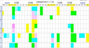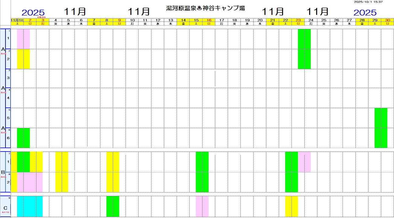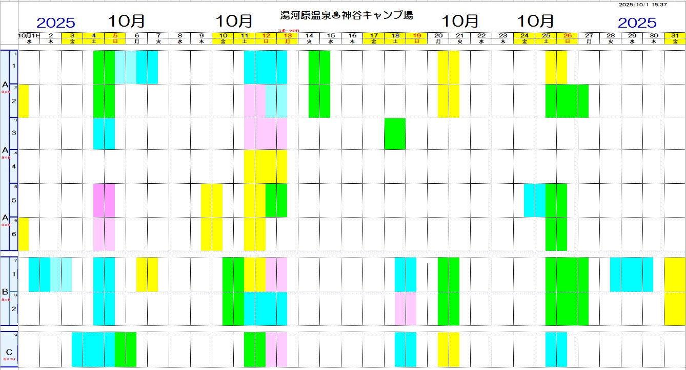 ※黄色(ソロ)、青(大人2名)、緑(グループ)、ピンク(ファミリー)部分はご予約済みです。